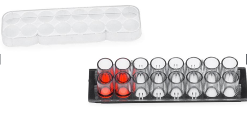盖玻片上的腔室共16个,分2排,各8孔(如图示),每孔的内直径6mm。设计的每孔体积和孔距与标准96孔板的相同,无细胞毒性的硅胶孔垫片(silicone well gasket)与上层聚苯乙烯材料的腔室(the upper structure,厚0.5mm)和基层的硼硅酸盐盖玻片(the substructure,厚0.16-.19mm)形成滴水不漏的密封。有上层腔室时每孔体积250µl,去掉上层腔室后每孔体积9µl。